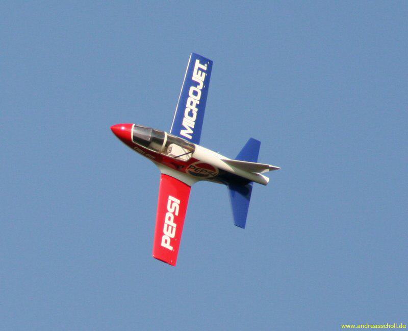 Bei Petrausch gab es dann die passende Pilotenpuppe. Zunächst wurde die ca. 18kg schwere Maschine problemlos mit einer JetCatP80 geflogen! Es sollte jedoch der Start von Gras erfolgen können, so daß wir dann auf eine P120 umgerüstet haben. Dies führte dazu, daß die Maschine zu einem wahren "Ackergaul" wurde! Von ungepflegten Graspisten benötigten wir etwa 65 Meter zum Start. Im Flug verhält sich die BD5 wie ein schnelles F3Ax- Modell mit dem alle Figuren problemlos geflogen werden konnten. Nach der Jet-WM 99 in Österreich, wo ich mit der Maschine den 5. Platz in der Team-Bewertung belegte, wurden noch sehr viele umfangreiche Testflüge gemacht. Hierbei zeigte sich, dass zum Landen sich eine Butterfly-Stellung der Landeklappen und Querruder als hervorragende Landehilfen bewährte. Leider ging meine erste BD5J aufgrund eines Senderausfalls beim Jet-Meeting in Helchteren/Belgien (April 2000) verloren. Mit der zweiten Maschine hatten wir ebenfalls Pech: Beim Erstflug versagte das 16kp-Höhenruder-Servo von Futaba seinen Dienst. Die Maschine wurde total zerstört. Nummer 3 in Bau und wir wurde Ende September 2000 eingeflogen. Leider ging auch dieses Modell durch ein unerklärlichen Anlagenausfall (statische Aufladung? es herrschte Gewitterlage) nach mehr als 40 Flügen bei der Fiberclassics Airshow in Ballenstedt 2001 verloren. Pepsi-BD5 Am 6.7.2005 war es wieder so weit: Ich konnte meine neue BD5 einfliegen. Bei starkem Seitenwind und starkem Regen im Landeanflug tat die BD5, was sie sollte: Sie flog!!! Und das ohne einen Klick zu trimmen!! Sie ist wahnsinnig schnell (so schnell wie ein Hotspot) und läßt sich aber dank der senkrecht nach unten ausfahrenden Landeklappen auch extrem langsam fliegen.