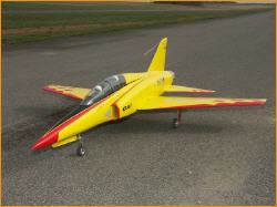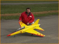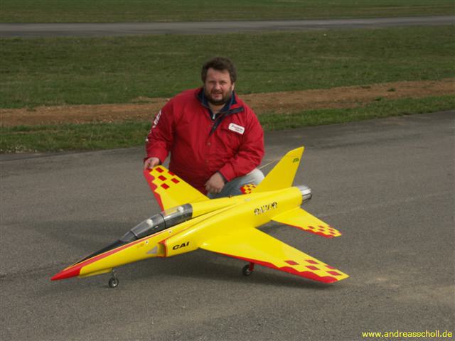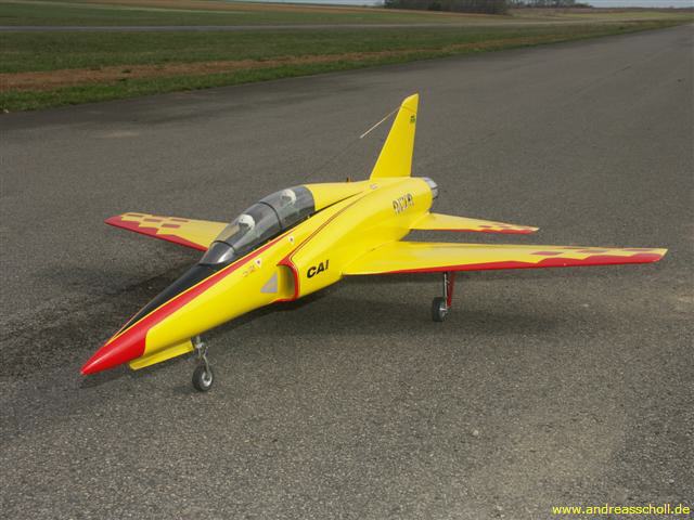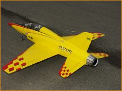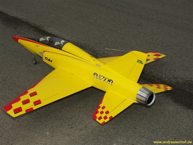 Der RAZOR von CAI (die Firma gibt es leider nicht mehr) ist ein außergewöhnlicher Sport-Jet. Mal eben kein Kangaroo und kein Hotspot. Die Flugeigenschaften sind unkritisch, obwohl man sich am Anfang an den recht großen Höhenruderausschlag gewöhnen muss, den man braucht um die Maschine durch Kurven zu bringen oder abzufangen. Beim Landen sind die großen Landeklappen nicht nur schöne Optik sondern absolut notwendig, da sich die Maschine ohne sie nicht langsam machen läßt. Das Flugbild ist außergewöhlich. Mit einer JetCat P120 absolut übermotorisiert (es würde eine P60 reichen), die Geschwindigkeit übertrifft die eines anderen Sportjets mühelos, wobei man aufpassen muss, daß man die doch recht kleine Maschine nicht aus den Augen verliert. Allerdings kommt der Flieger wegen dem hohen Gewicht mit der P120 sehr schnell zur Landung rein. Die kleinen Räder sind nicht unbedingt für Rasenplatz geeignet