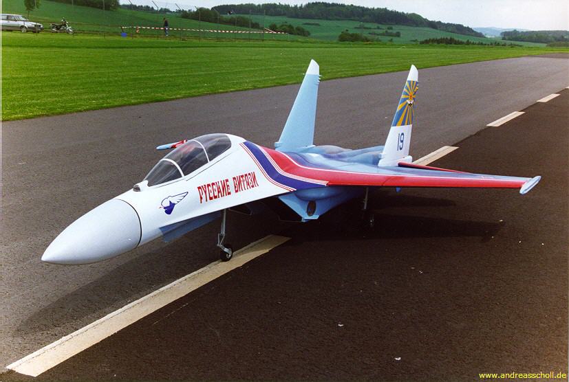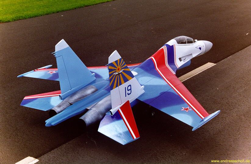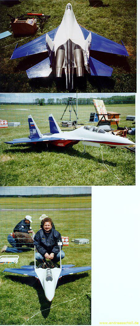 Die erste SU27UB aus dem damaligen Voll-GFK-Bausatz von Andy Schleicher war mein zweiter Jet. Der Erstflug erfolgte auf einem Jet-Meeting in Belgien und war ein voller Erfolg. Die Flugeigenschaften dieser Maschine waren exzellent. Allerdings musste die Landeeinteilung exakt geübt werden. Die erste Maschine stürzte bei einem Jet-Meeting in Paris ab. Die zweite Maschine bei der Qualifikation zur WM97 in Müllheim. Beide Absturzursachen unbekannt. Die ersten Lackierungen waren die der Russischen Ritter.
