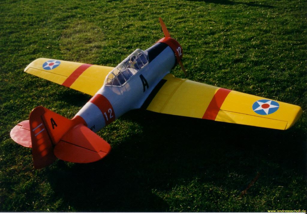 Wenn ich könnte, würde ich mir diese Maschine sofort noch einmal kaufen! Ein fantastisches Flugbild, ein Klasse-Motorsound und tolle Flugeigenschaften! Spezialität: Die Original-Riesenfaßrolle! Allerdings empfand ich die Landung immer als sehr schwer, obwohl ich schon viele T6 gesehen habe, die wunderbar langsam gelandet wurden. Vielleicht lags am Gewicht? 5.7.2003 :Jetzt habe ich wieder eine!! Entstanden aus dem gleichen Baukasten mit den gleichen technischen Daten wie unten. Allerdings hat diese keine durchgehende Fläche mehr, sondern ein Flächenmittelstück mit ansteckbaren Flächen, so daß sie wunderbar transportiert und montiert werden kann. Die Flugeigenschaften sind unvergleichlich besser als bei der ersten, obwohl sie das gleiche Gewicht hat. Die Langsamflugeigenschaften sind perfekt, und die tiefen Überflüge mit hängender Fläche stehlen jedem Jet die Schau! Damit scale-mäßiges Fliegen richtig Spaß, wenn das Walter und Toni Eichhorn sehen würden, die würden mich sofort mal einladen...